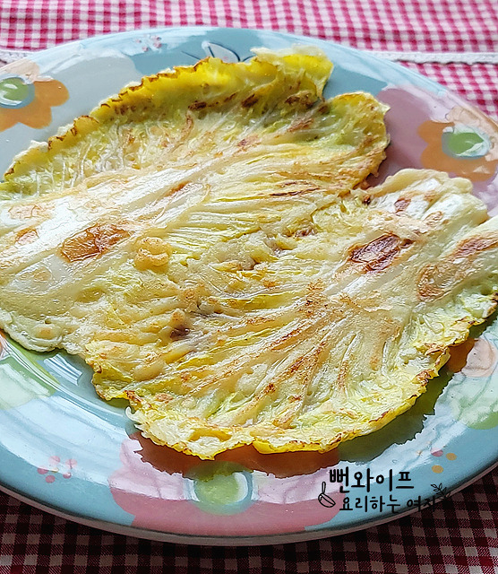 부칠 때 들뜨지 않도록 배추 줄기 부분에 칼집을 한두 개 넣어주면 좋습니다.