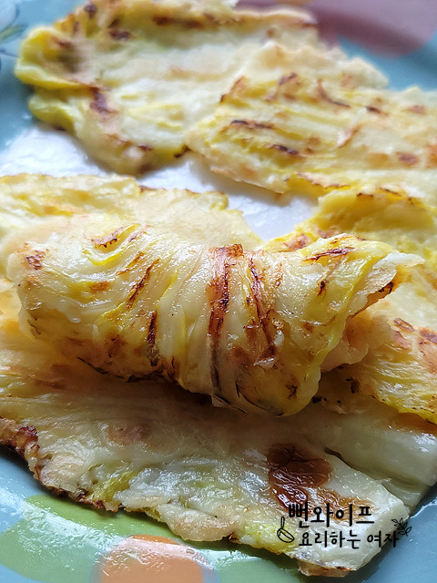넉넉하게 부쳐서 먹고 식은 배추전은 썰어서 냉장고에 두었다가 꺼내 먹어도 아주 좋습니다.
