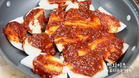 그 위에 양념의 반을 무에 골고루 발라 주세요.